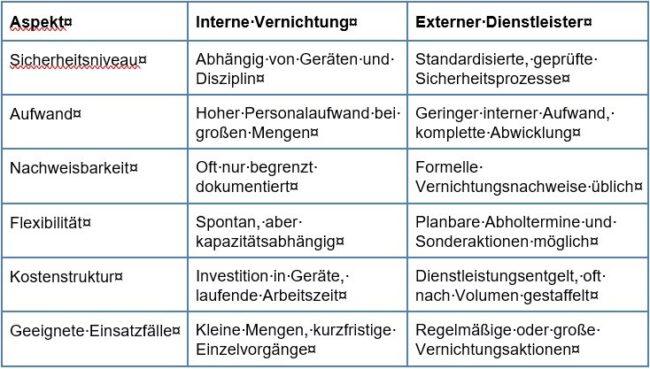 Vergleich: Interne Vernichtung vs. externer Dienstleister